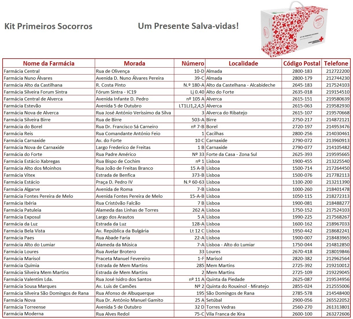 Nota: para além das farmácias aderentes, este Kit encontra-se à venda no Hospital da CVP e na Escola de Socorrismo CVP, ambos em Lisboa.